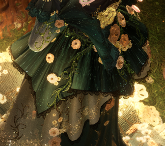 The dress features a white-and-green color scheme with intricate layered ivy embroidery and floral appliqués adorning the bodice and skirt. Delicate lacework and sheer gauze create a fresh, vibrant feel that embodies nature's vitality. The structured petticoat at the waist mimics the gentle unfurling of a blooming flower. When our little sorceress soars through the sky, the skirt sways like a blossom caressed by breezes against the azure sky.