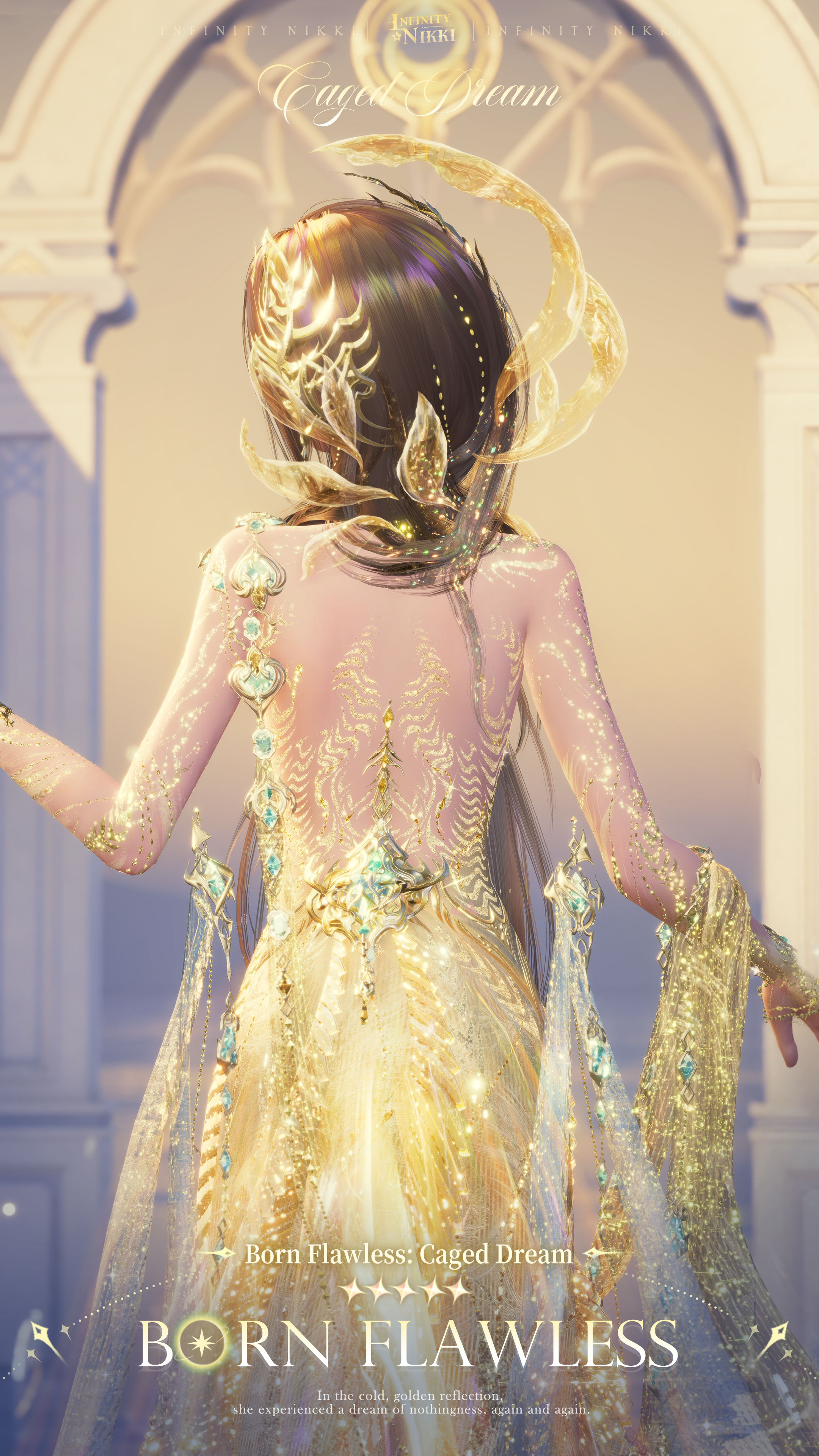 The headwear [Newborn Condolence] and backpiece [Cuts of Fate] of the 5-star outfit [Born Flawless] can switch to alternate details upon acquisition.