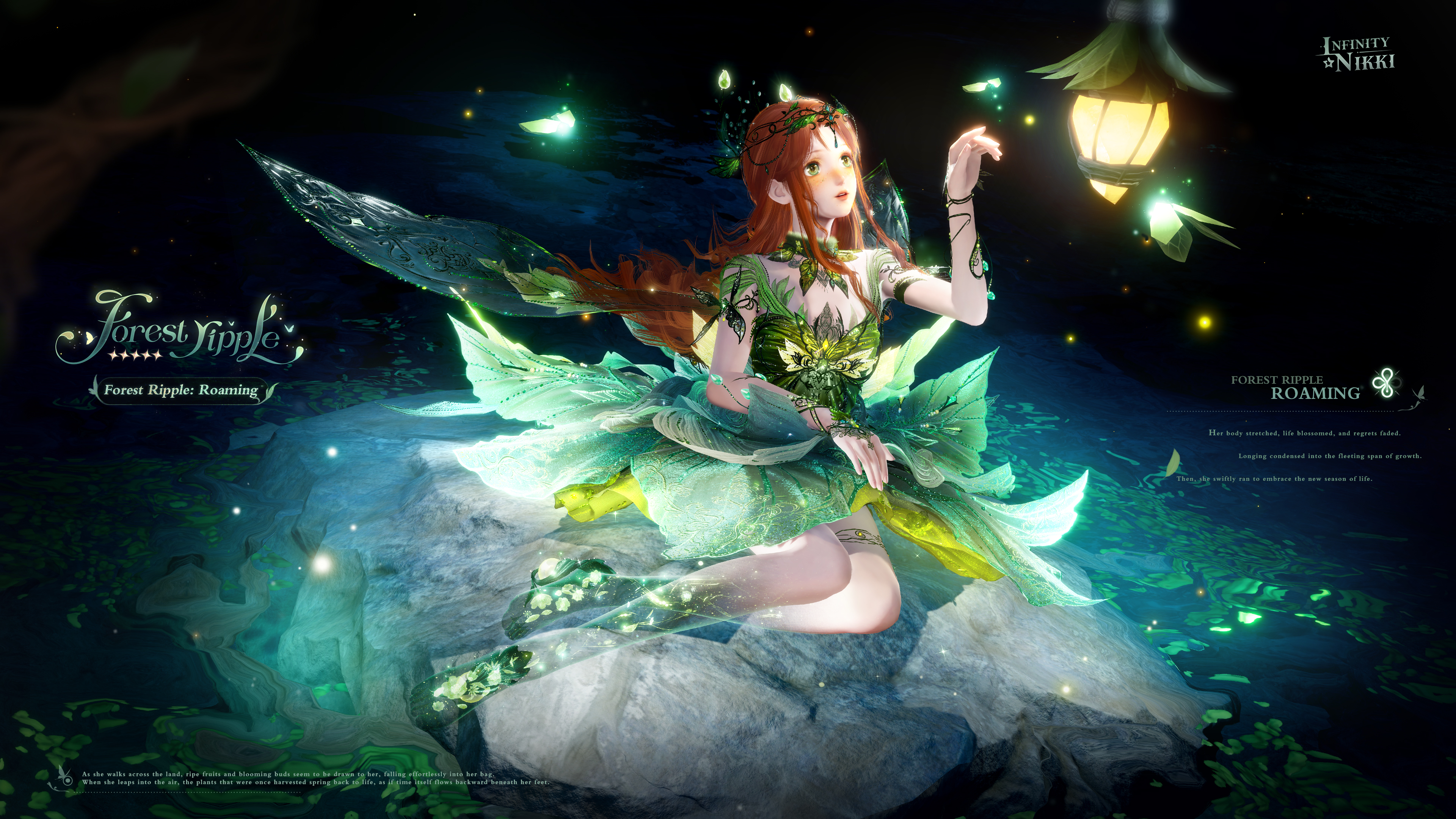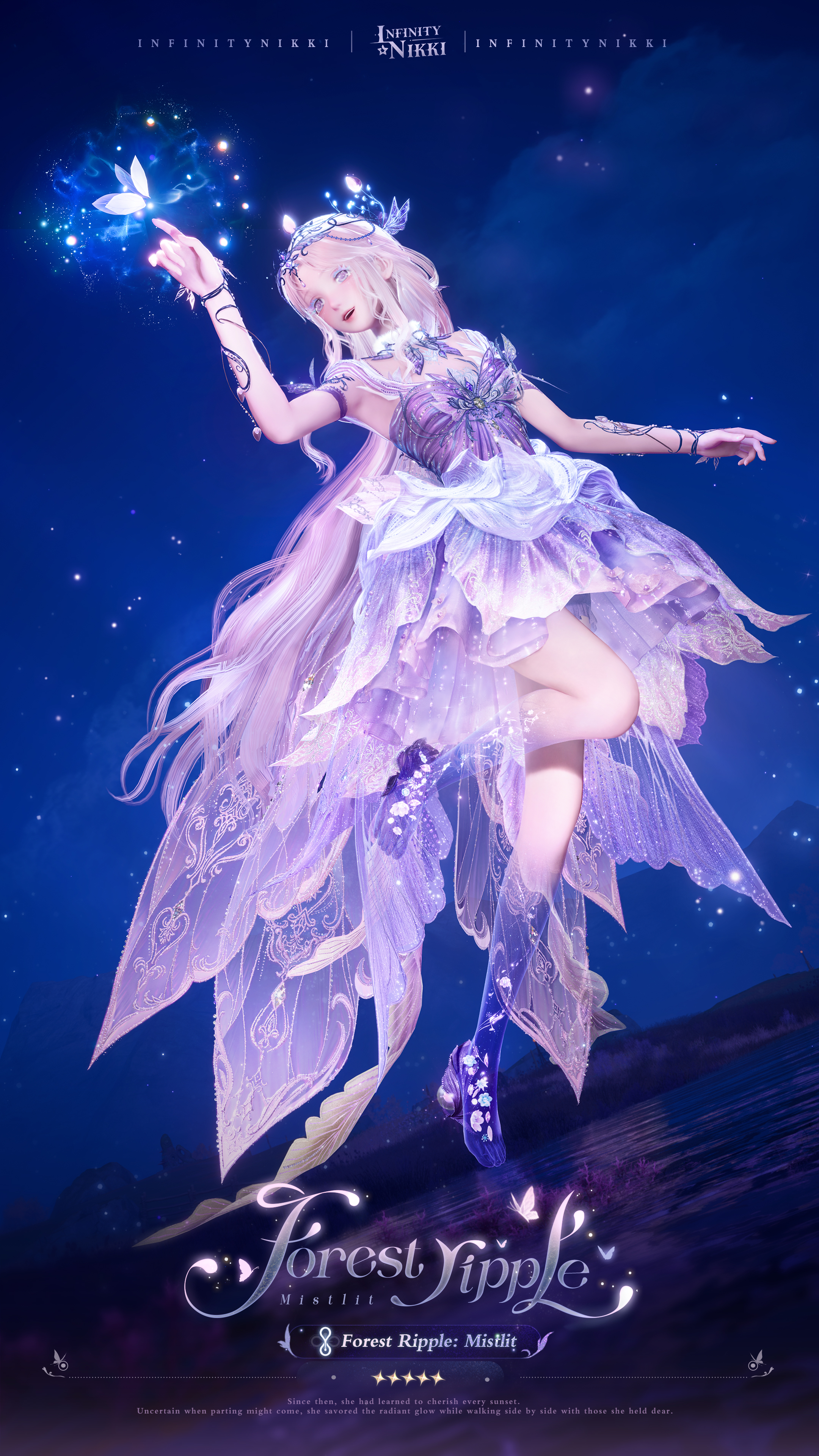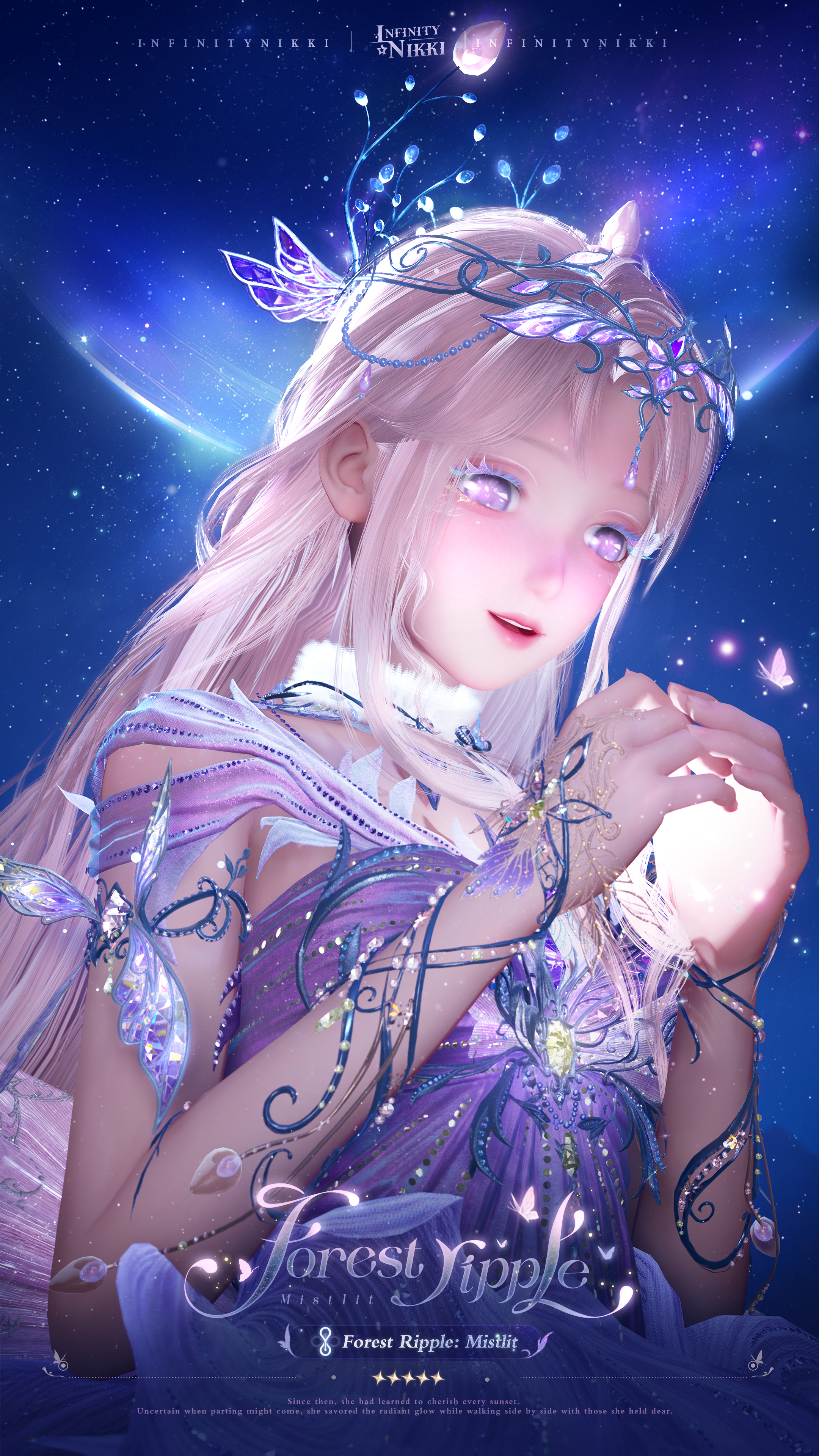 >>Evolve the 5-star outfit [Forest Ripple] to Stage 3 to unlock [Memory Ripple: Makeup], enhanced special effects, a new idle animation, and alternative details for certain pieces.