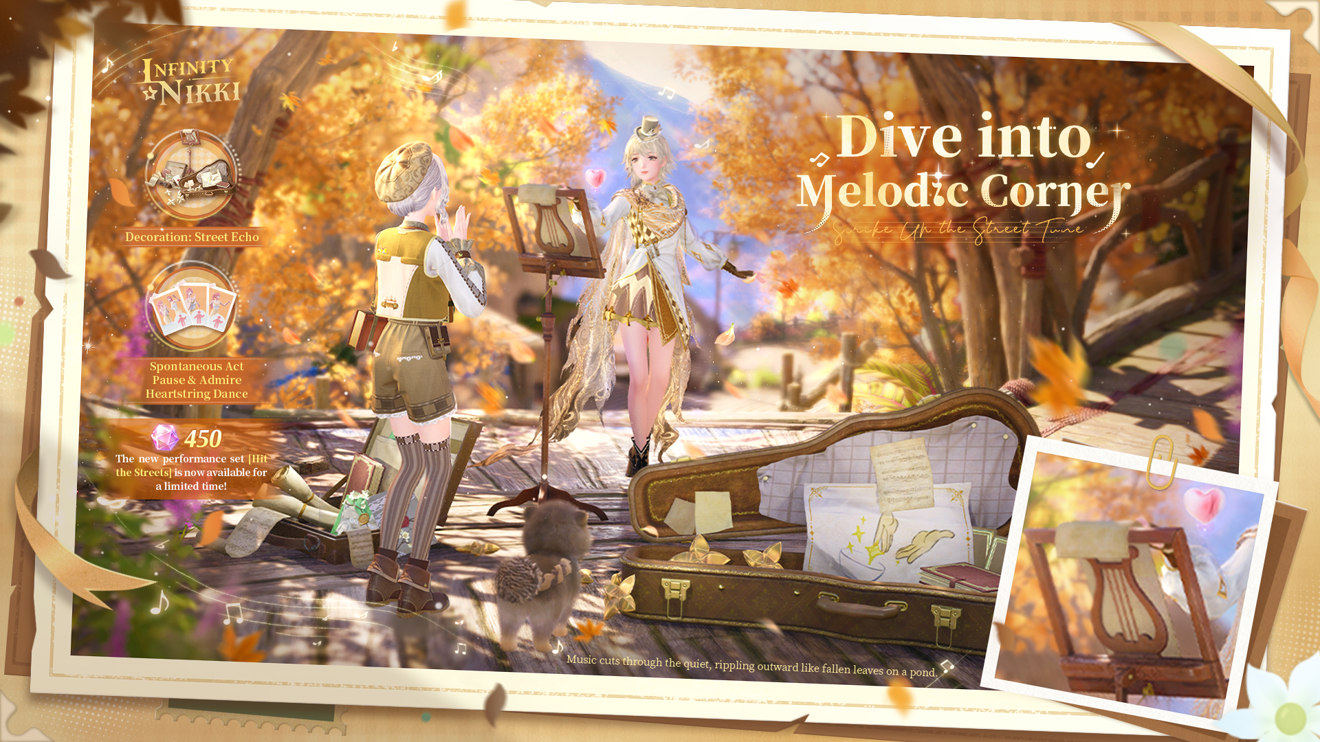 ● Spend 450 Diamonds to obtain Decoration [Street Echo] and Duo Action [Spontaneous Act], plus bonus Solo Actions [Pause & Admire] and [Heartstring Dance]!