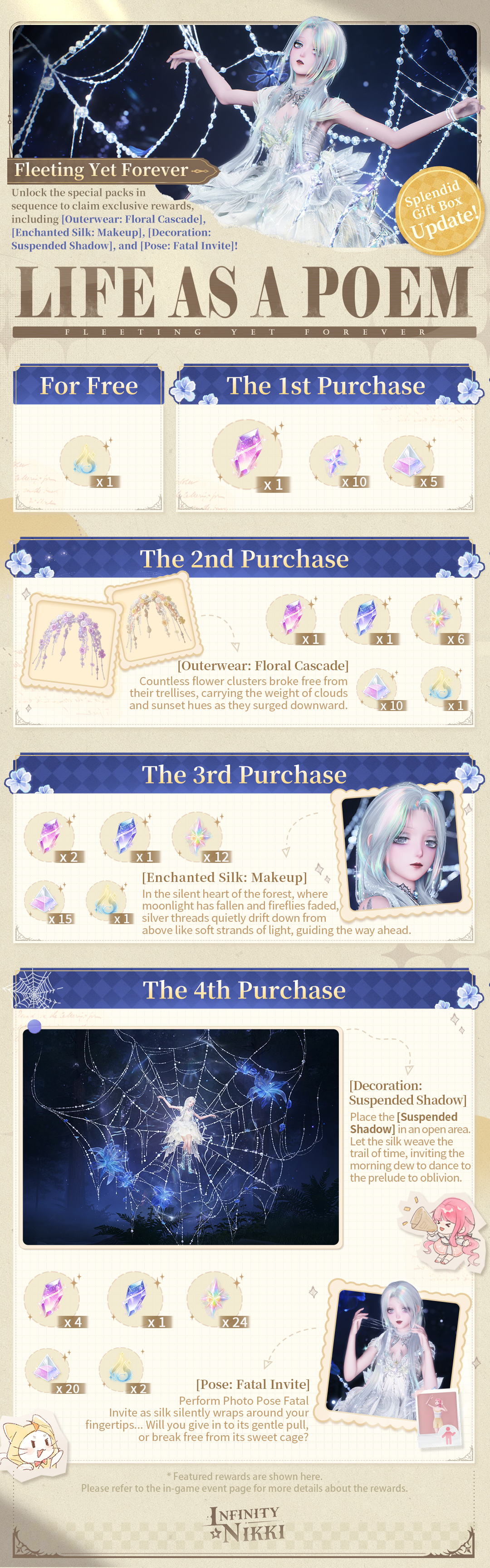 The Version 2.1 "Life as a Poem" value event is available for a limited time! Unlock the special packs in sequence to claim exclusive rewards, including [Outerwear: Floral Cascade], [Enchanted Silk: Makeup], [Decoration: Suspended Shadow], [Pose: Fatal Invite], [Resonite Crystals], and [Revelation Crystals]! For more details, please refer to the in‑game announcement.