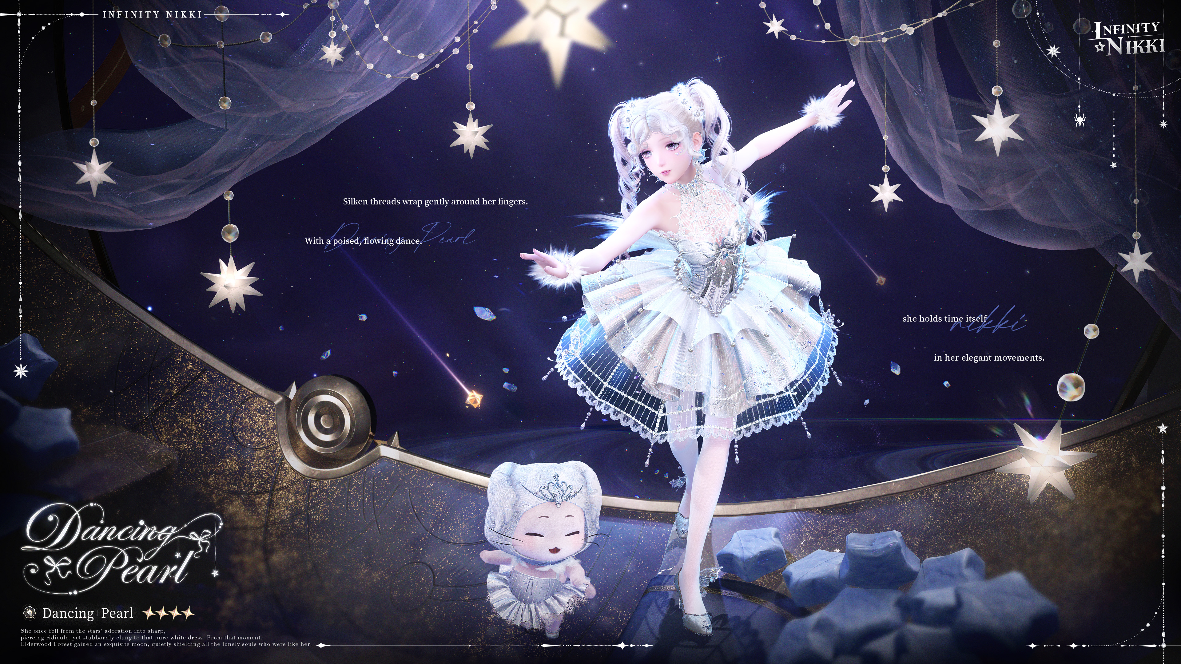 [Tethered Dance: Whimsicality]: Silken threads wrap gently around her fingers. With a poised, flowing dance, she holds time itself in her elegant movements.