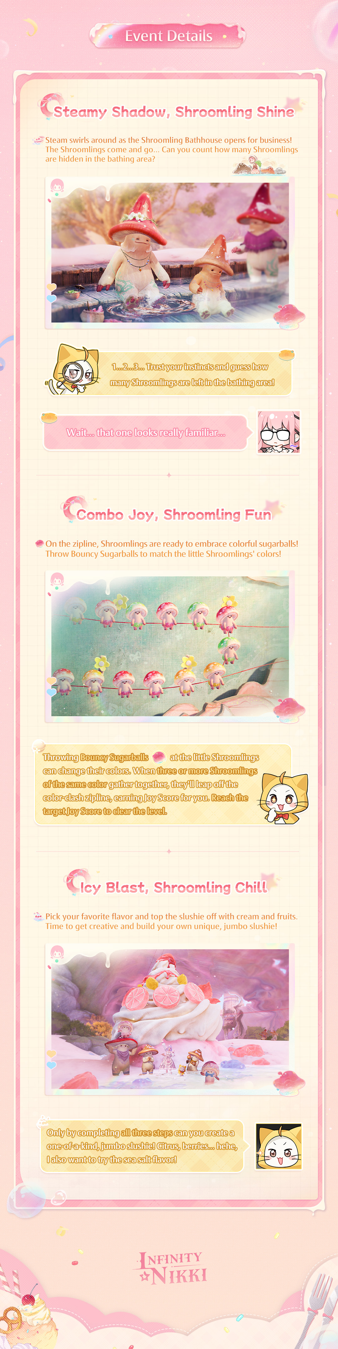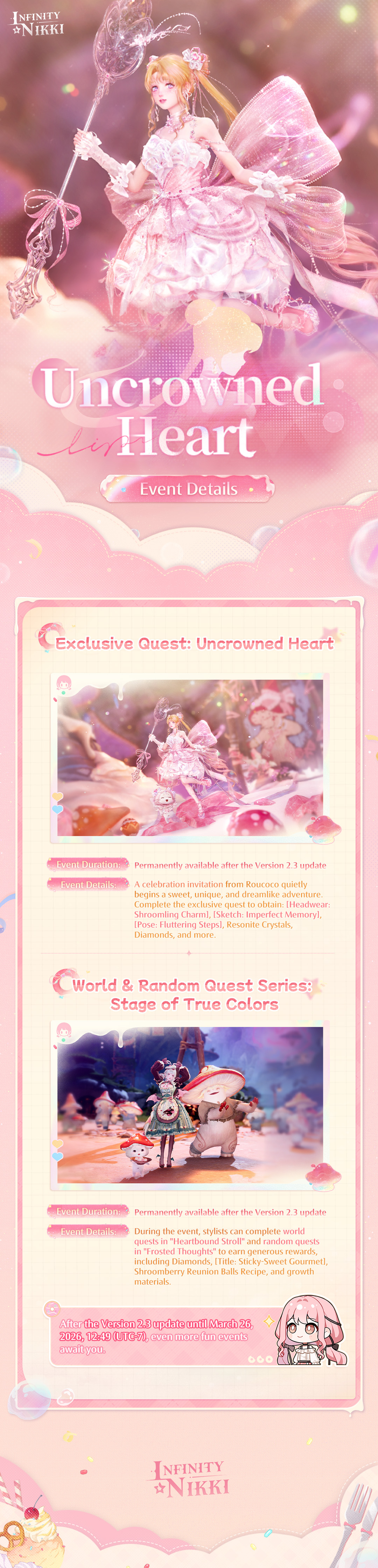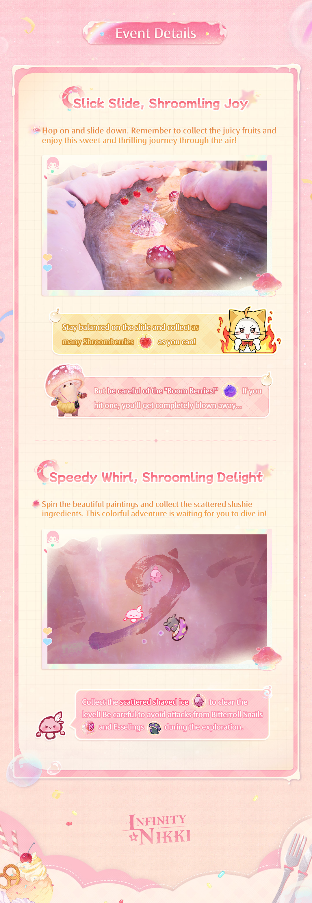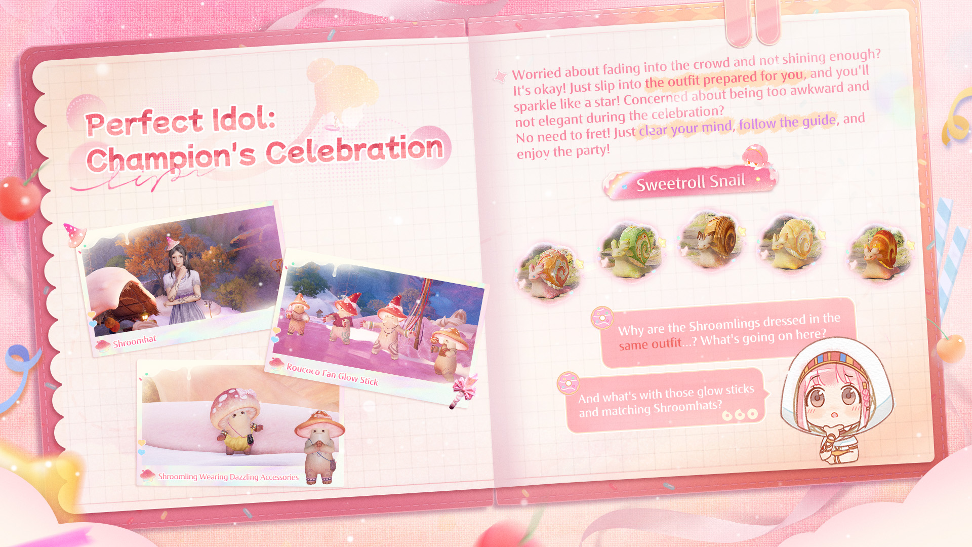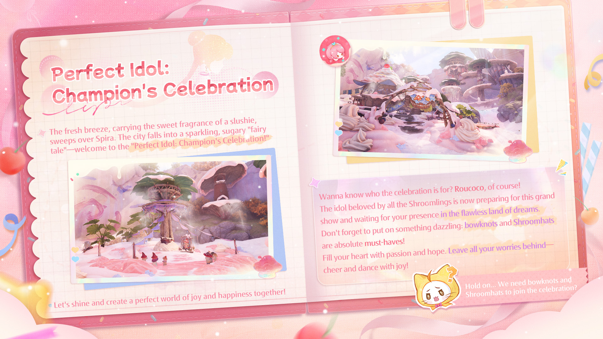 A celebration invitation from Roucoco quietly begins a sweet, unique, and dreamlike adventure. Complete the exclusive quest to obtain [Headwear: Shroomling Charm], [Sketch: Imperfect Memory], [Pose: Fluttering Steps], Resonite Crystals, Diamonds, and more.