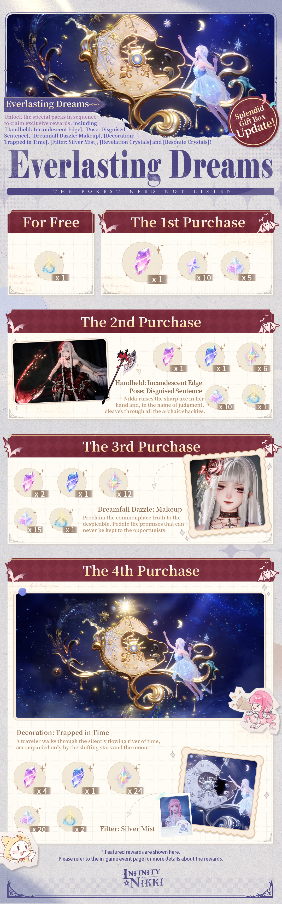 The Version 2.4 value event is available for a limited time! Unlock in sequence to claim [Handheld: Incandescent Edge], [Pose: Disguised Sentence], [Dreamfall Dazzle: Makeup], [Decoration: Trapped in Time], [Filter: Silver Mist], [Revelation Crystals], [Resonite Crystals], and more! For more details, please refer to the in‑game announcement.
