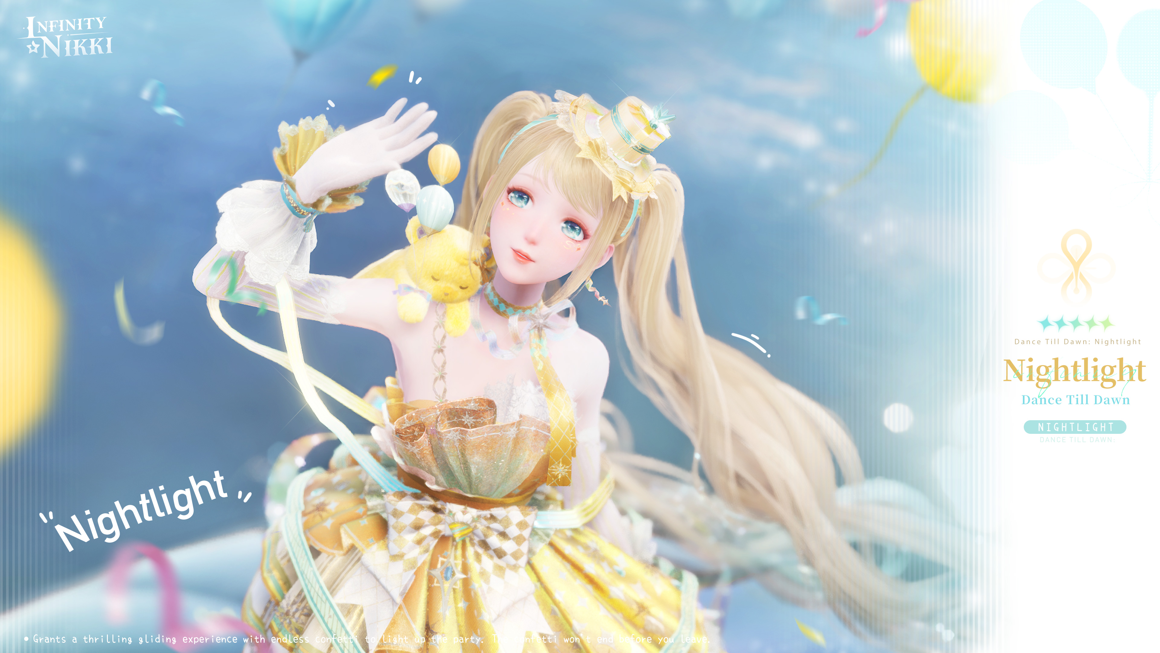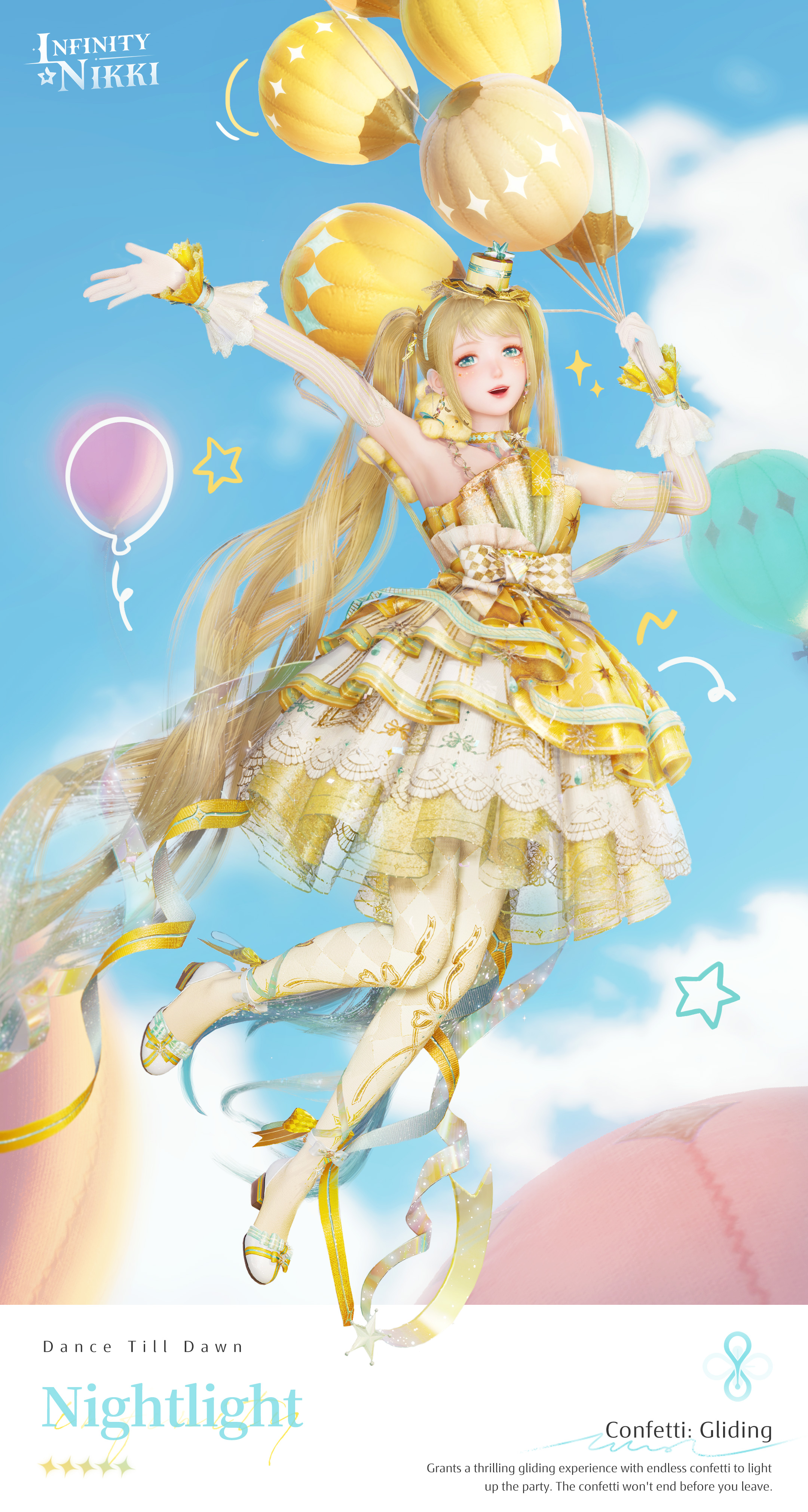 [Dance Till Dawn] can be evolved into the following: [Dance Till Dawn: Nightlight] (Stage 1), [Dance Till Dawn: Boat] (Stage 2), and [Dance Till Dawn: Fireworks] (Stage 3). Fully glow up the outfit to unlock [Dance Till Dawn: Star Melody].