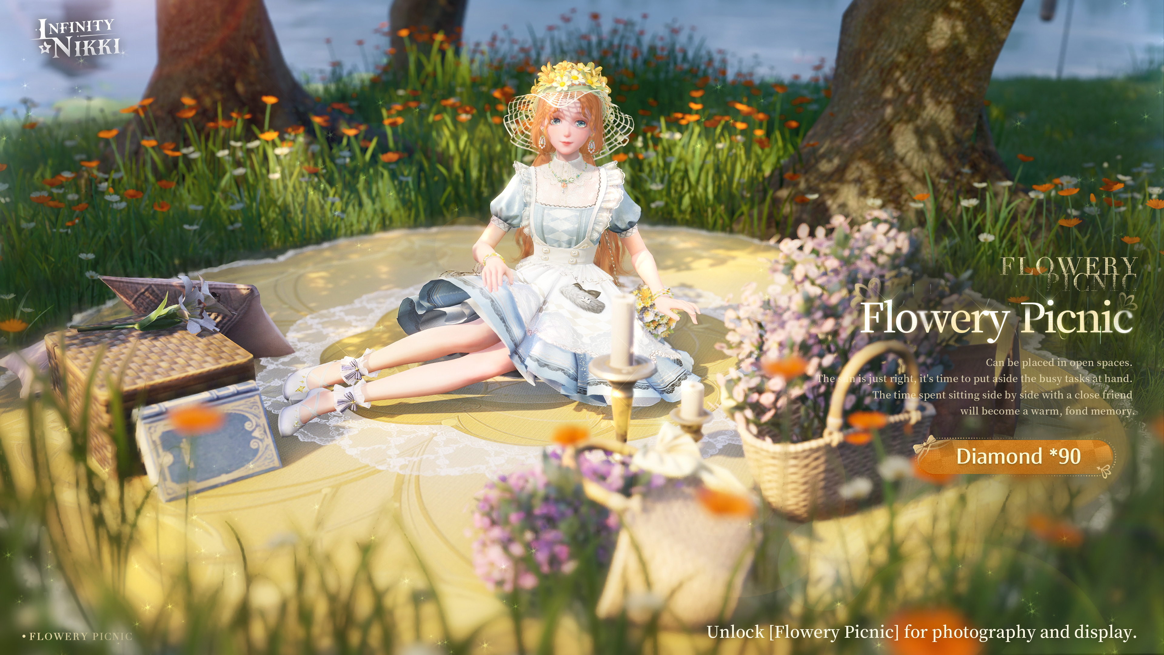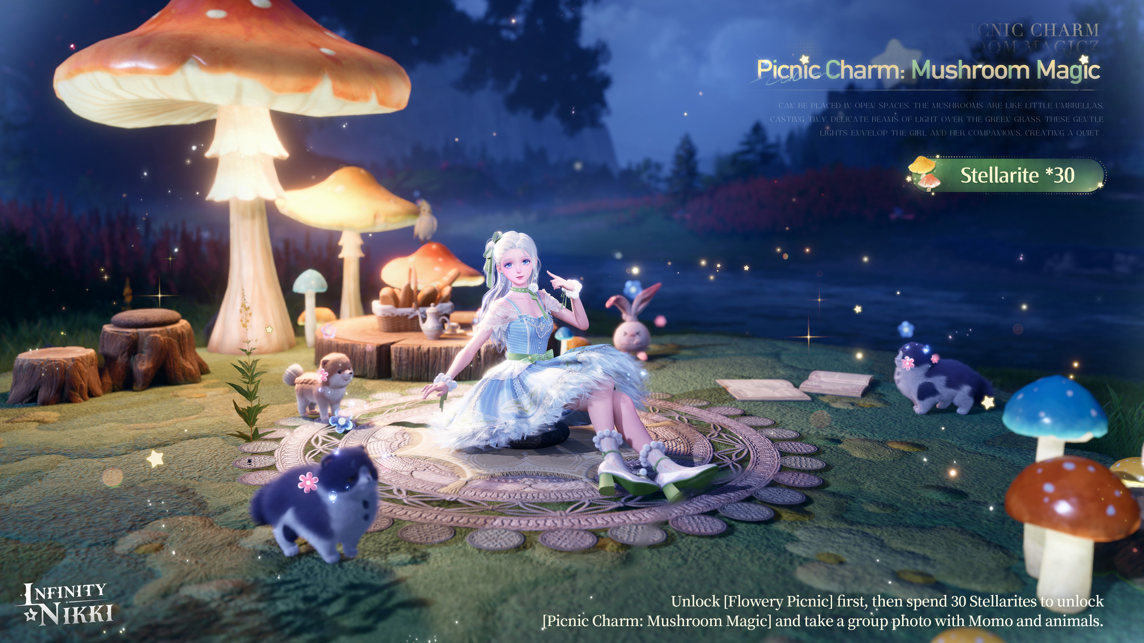 Spend 90 Diamonds to unlock [Flowery Picnic] for photography and display. Then, spend 30 Stellarites to unlock [Picnic Charm: Mushroom Magic] and take a group photo with Momo and animals.
