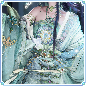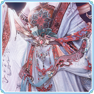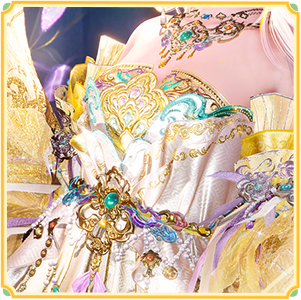 【トップス・人世の春景】軽やかな霊鹿には、山野や雲の間を駆け回る姿が欠かせません。そのため、トップスのデザインは、軽やかさと可憐さ、そして動きやすさを重視しており、同時に衣装としての華やかさも失わないものにしています。胸元のレイヤーは、色とりどりの霞が幾重にも広がるような造形で、裾のドレスは幾重もの層を重ね、繊細な宝玉の珠飾りがあしらわれています。白金の衣は陽光を受けてきらめき、軽やかで美しい霊性を際立たせています。
