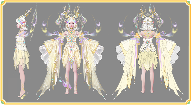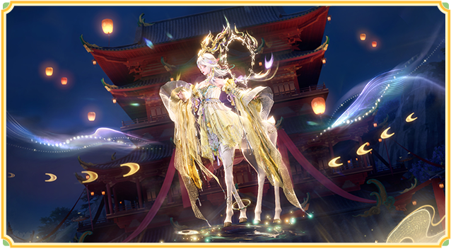 このコーデスキルのデザインは、鹿が雲を踏みしめ、九天を霊妙に駆け上がる姿をイメージしました。山林を跳ね回る小鹿の動きをベースに、つま先で雲に触れる様は、まるでトンボが水面を掠めるかのようで、その跳躍と着地のたびに山河が波打つように揺らぎます。空中ダッシュ時には、五色の光が身体の動きに合わせて広がり、神聖な威厳と生命の躍動感を同時に表現します。さらにスキルを発動すると現実世界のヴェールを払い、金の小鳥が道を示し、神鹿の視界から宝箱の位置を探知できます。