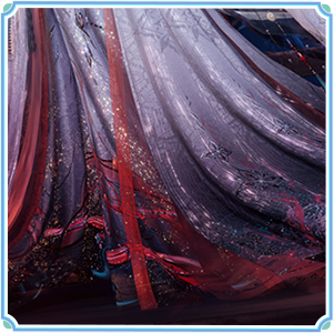 【コート・千面の語】ドレスの左右非対称な襟元に合わせ、幾重にも重ねた衣装構造でありながら、重たさは感じさせず、けだるい自然体な雰囲気だけを漂わせるデザインとなっています。華やかな衣で柔らかく垂れ落ちる感覚を表現し、薄布や多層の半透明の素材を用いました。さらに、精緻で複雑な花文様や珠飾りをあしらうことで、衣装全体の佇まいに、いっそうの気品と華麗さを添えています。