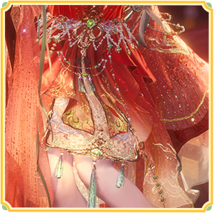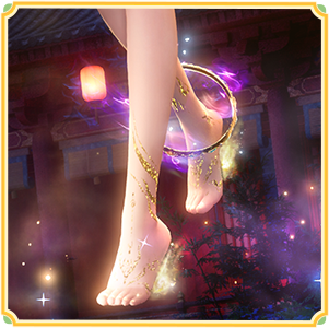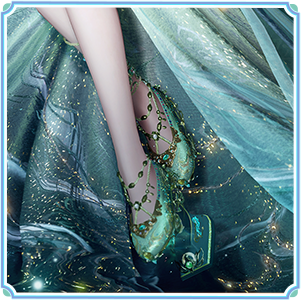 【シューズ・宝玉の賞嘆】シューズは素足に近いデザインとし、神鹿が山河を踏みしめ、軽やかに跳ね回る姿に寄り添うような造形になっています。足の甲には金色に輝く紋様を施し、瑞獣としての神性をさりげなく表現しました。片側の足首には、あえて大ぶりのアンクレットをあしらい、鹿の蹄が持つ細やかさと力強さを表現しています。さらに足裏には、光の粒を引き連れる霊球エフェクトを追加し、歩行時にきらめく光跡を残す演出とともに、下半身の視覚バランスを整えています。