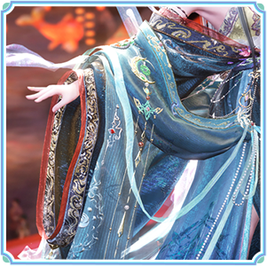 【ドレス・生業の授】ドレスは、伝統的な漢服に先進的なデザインを融合させ、伝統衣装としての華美な精巧さを備えつつ、同時に幻想的な創新性も併せ持っています。左右非対称の襟元は、気だるく自然体な雰囲気を際立たせます。腰には玉飾りの環佩(かんぱい)を連ね、色とりどりの布の模様や細かい装飾が重なって、衣装の高級感をさらに引き立てています。