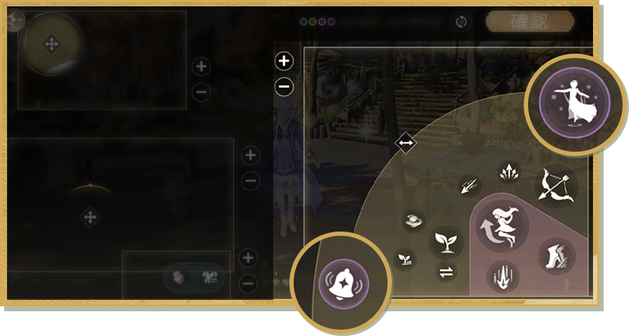 v2.3から、参考画像のように、右下にある操作エリアの全体位置の左右調整が可能になります。【設定】-【カスタマイズ】の【レイアウト設定】-【メイン画面レイアウト調整】から必要な設定を調整できます。鈴鳴ボタンと奇想の奥義ボタンの位置調整もできます!