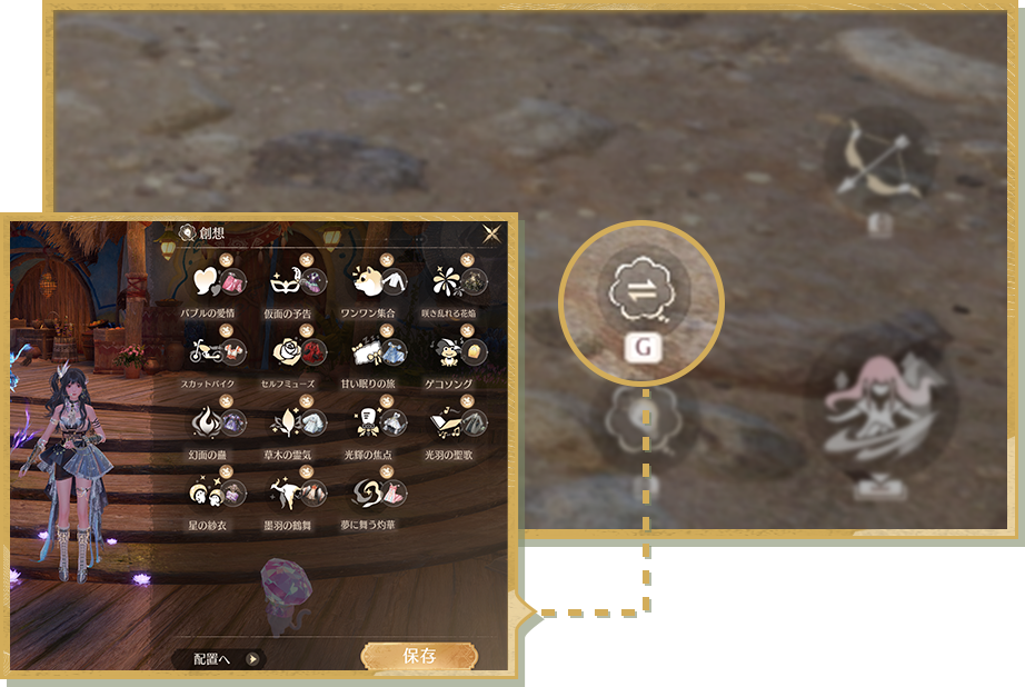 創想スキルを装備している場合、メイン画面のスキルボタン横に【クイック切替】ボタンが追加されます。当該ボタンから創想スキルリストを開いて素早く変更できるようになります。