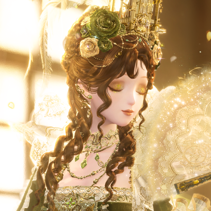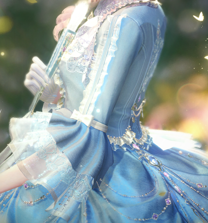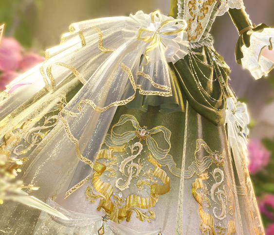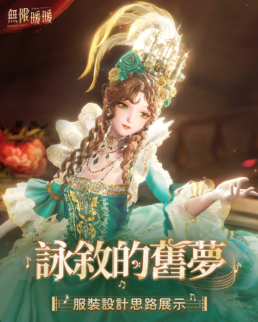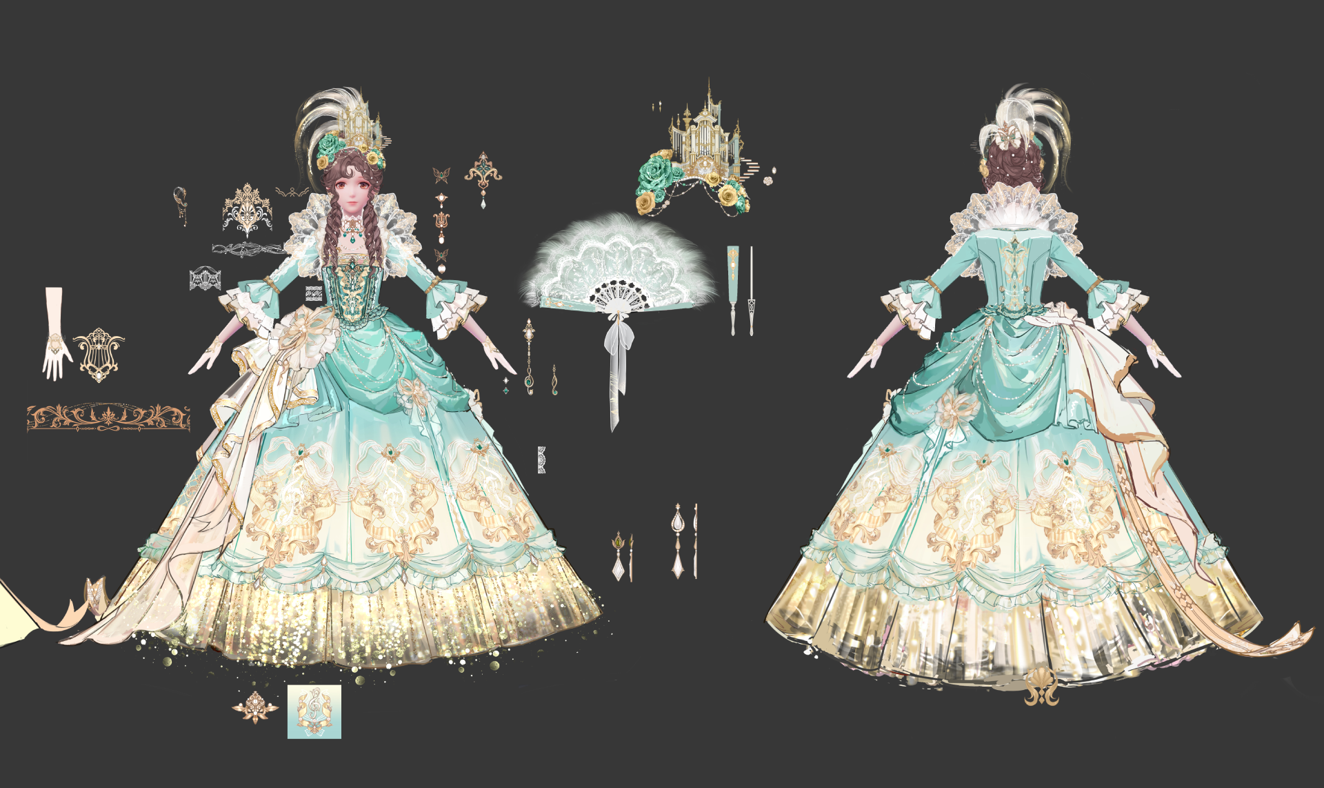 這次五星套裝的整體設計想要結合華麗的洛可可和巴洛克風格的服飾特點,同時表現出暖暖系列的少女感與幻想感,去製作一套真正華麗,優雅,奢靡的舞裙……它一定是由上好的緞子,精美繁複的刺繡和閃閃發光的珠寶組合成的,行走時裙擺輕輕拖過舞台的地毯會發出「沙沙」的聲音。圍繞這種氛圍感所想象出的整體框架,我們進一步填充了這條舞裙的細節設計,最終呈現出了「詠敘的舊夢」這套服裝。