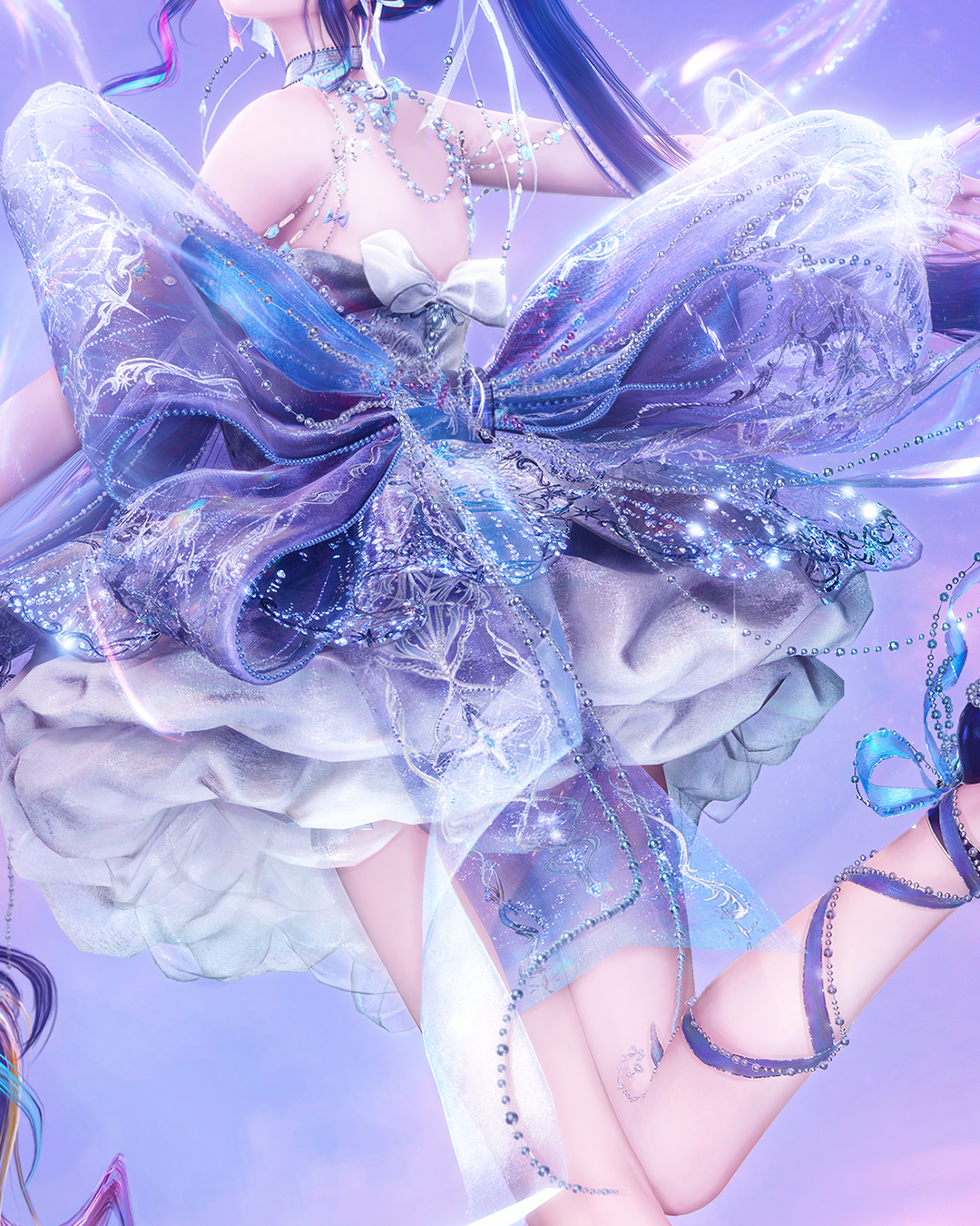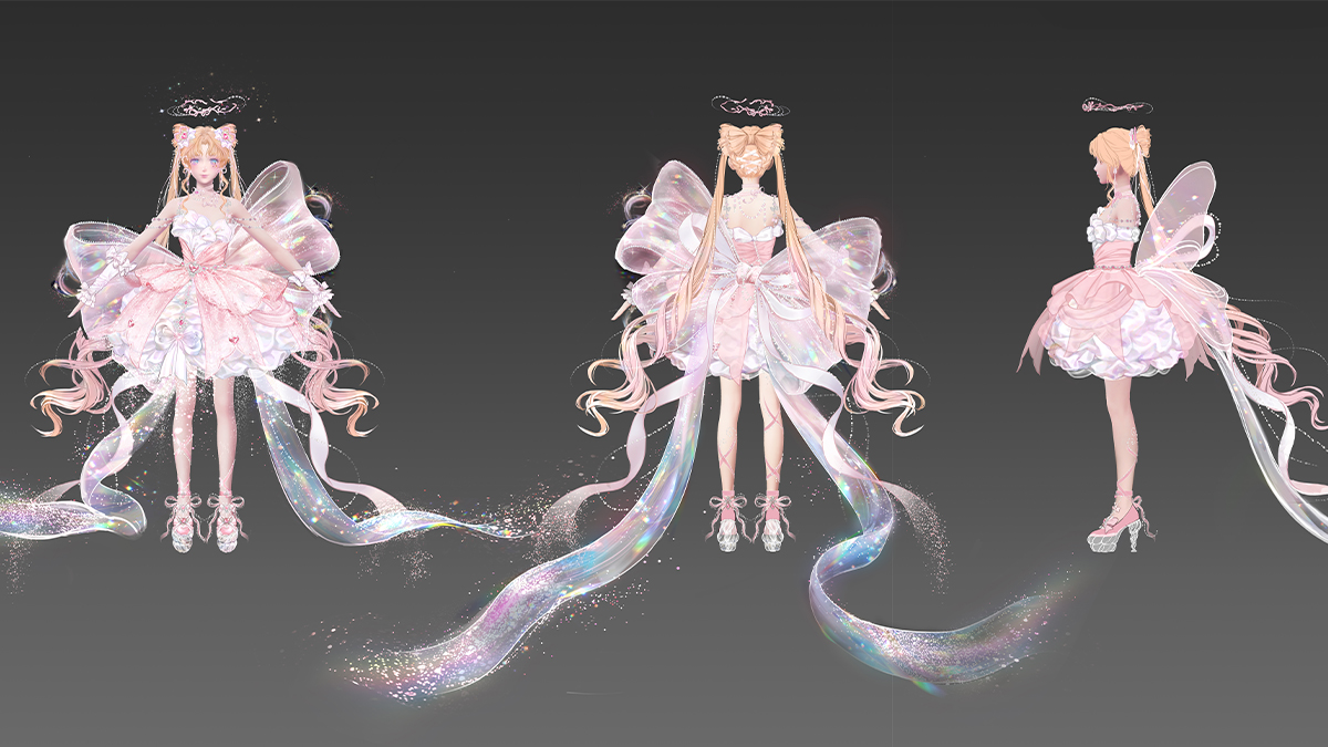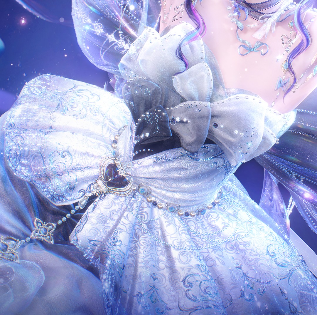 整套服裝散發童話般的甜蜜氣息,與獨角獸相映喚起無盡夢幻的遐想。緞帶光環的設計烘托了白日夢一般的奇幻氛圍,精緻的絲帶旁不斷逸散著星光般的點點糖霜,就好像將微縮的糖霜銀河裝飾於頭上。