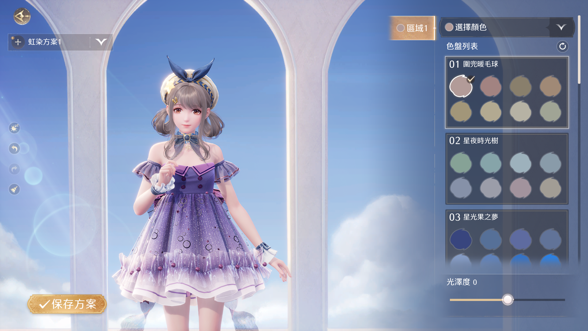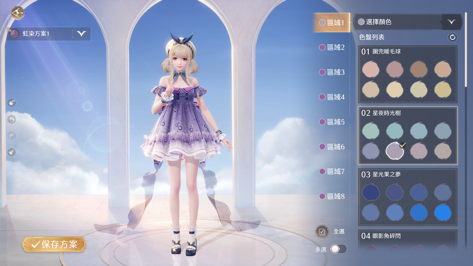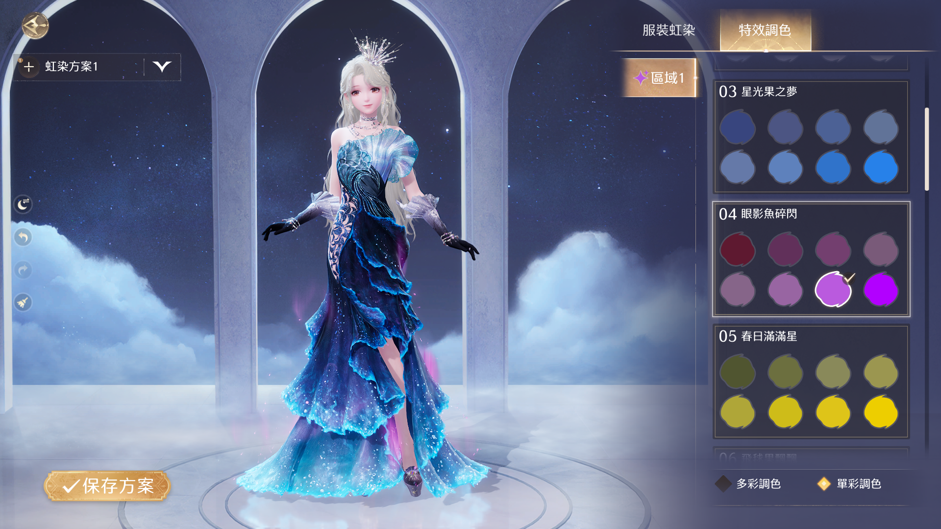根據每件服裝的設計,將會開設不同數量的分區。可透過消耗對應數量的服裝虹染道具,解鎖虹染色盤,為不同的分區染上自己喜歡的顏色並保存。