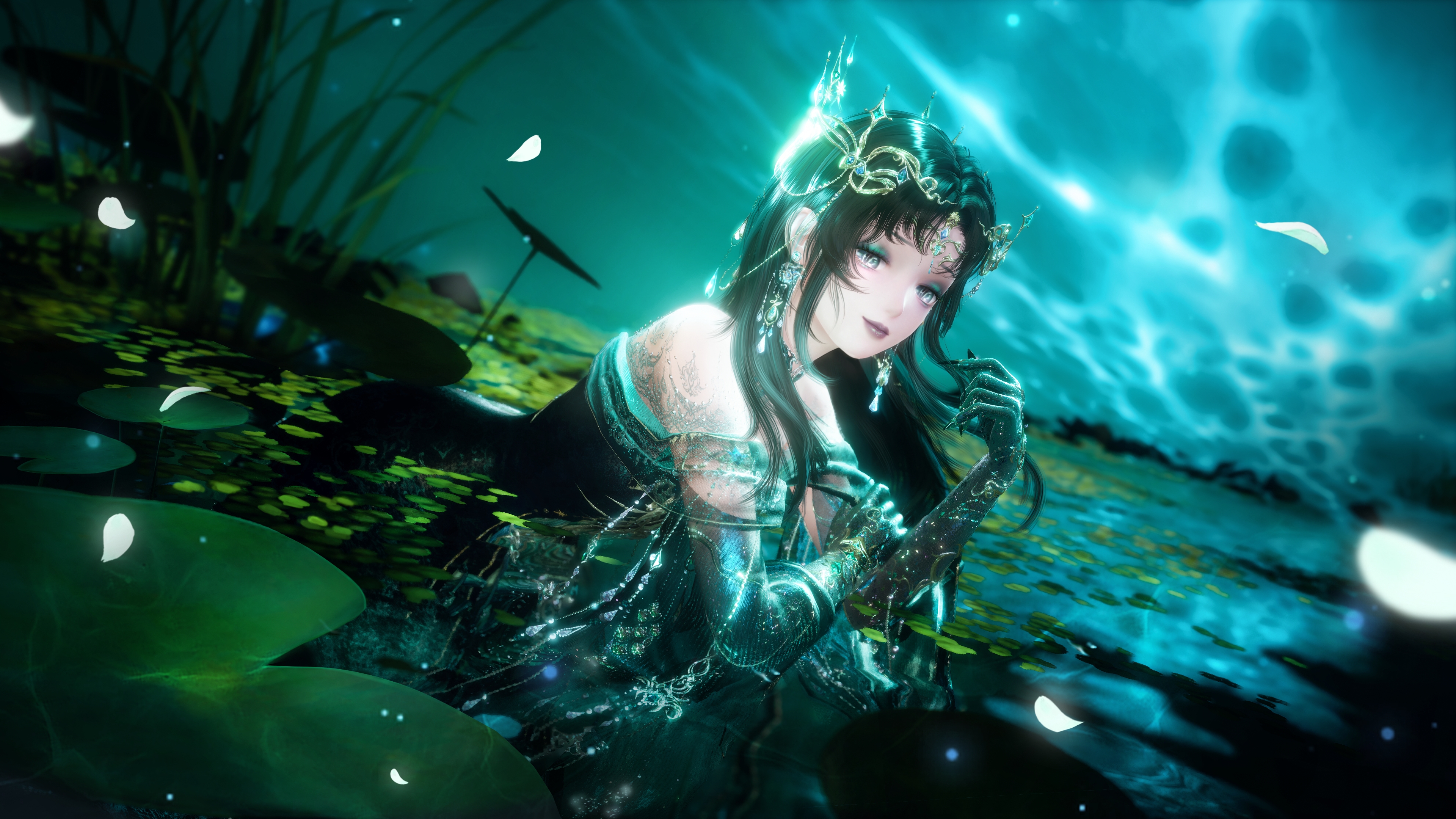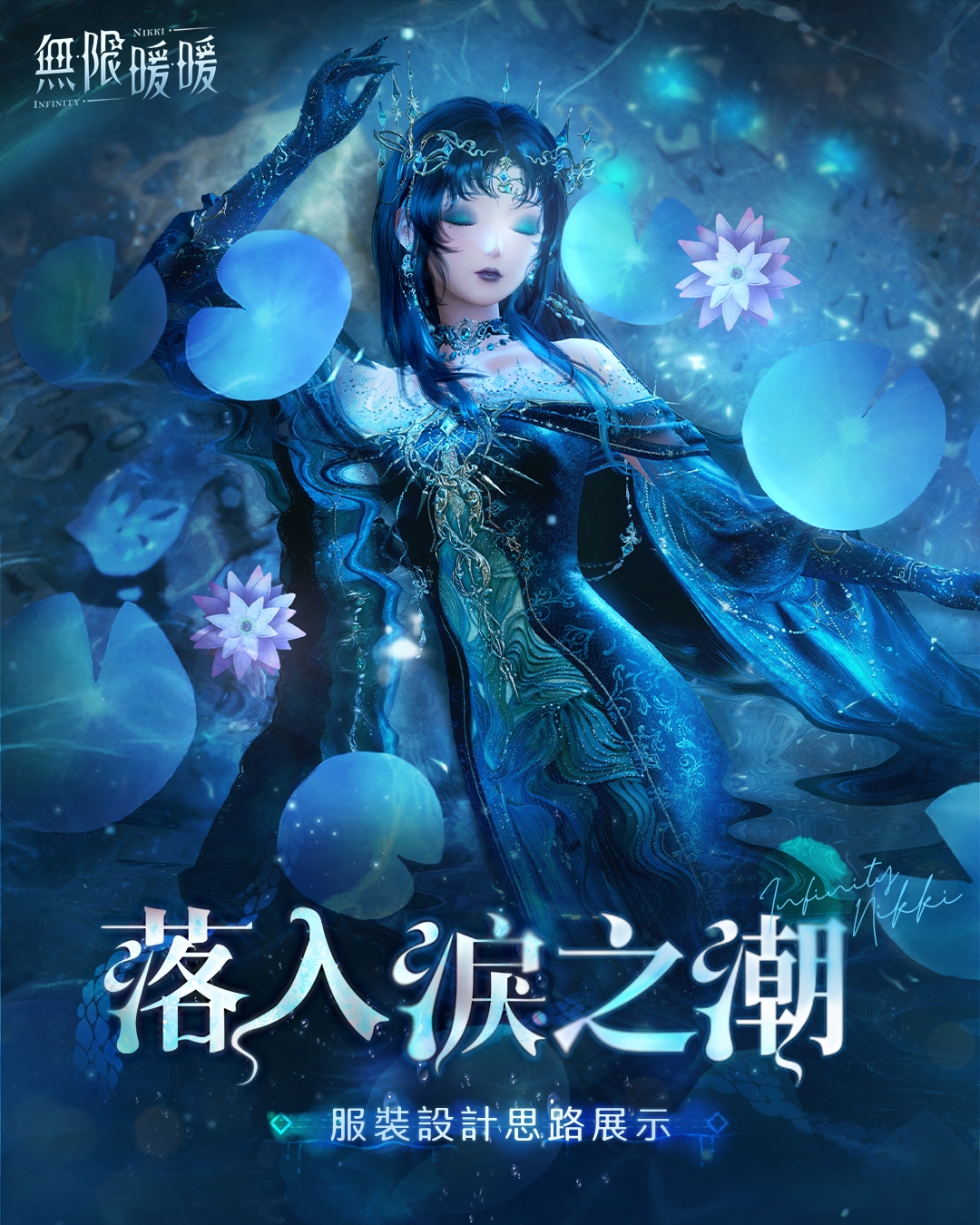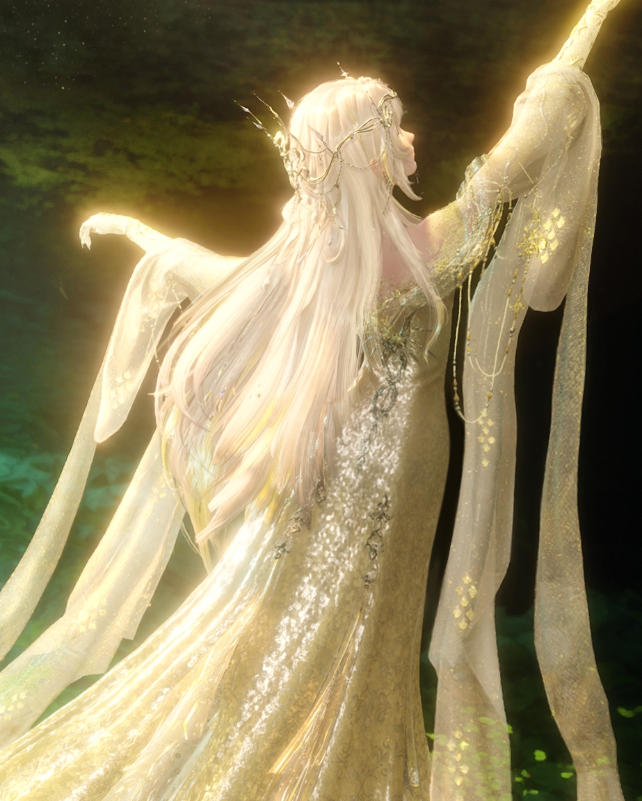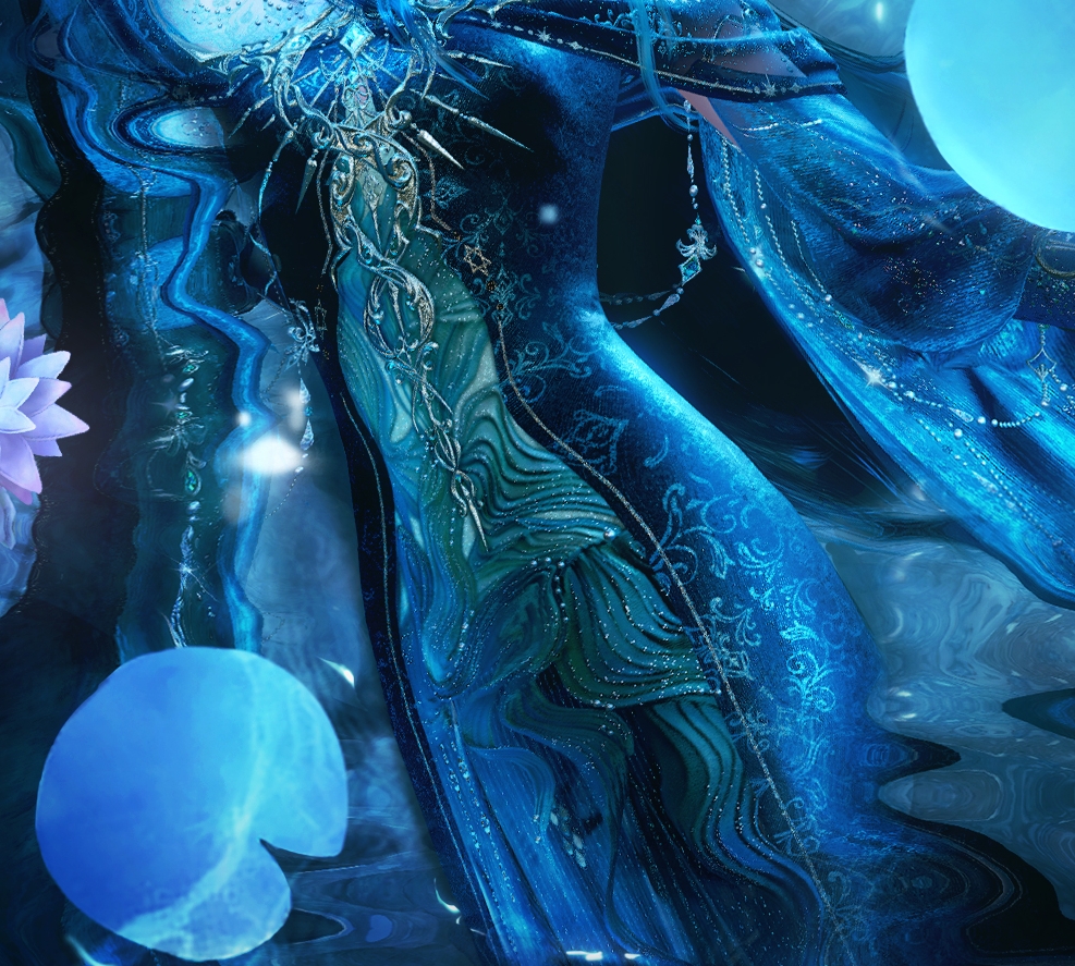 鱗片早已與攀上岸邊的幽綠苔蘚、無休無止的藍眼淚共生。當痛苦襲來,她以仰望的姿態看向被束之高閣的華服。那第一滴藍眼淚化作的寶石輕輕搖晃,開始將過去的嗚咽吟唱。