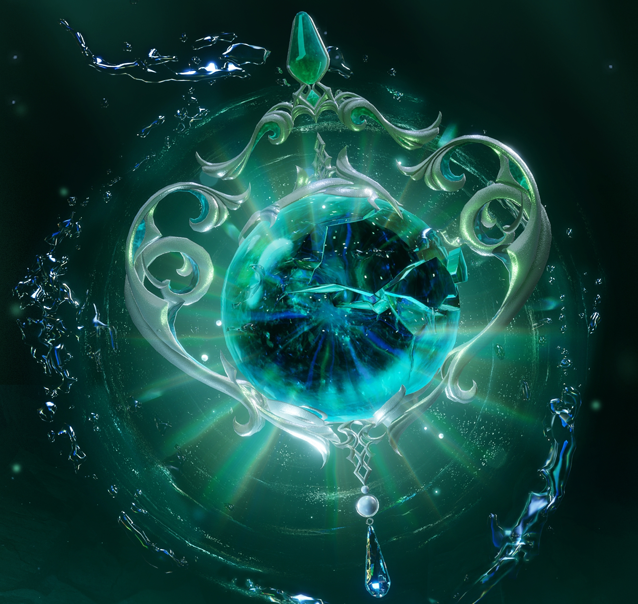 【手持物·冥冥之心】用以施法的寶珠周身環繞有水流特效,凝聚著水澤的力量。結合美術團隊對於套裝核心氣質的把握,寶珠在設定上略有破損,但破損處又閃閃發光,暗藏著其過往的故事經歷。神秘又貴氣的墨綠色寶珠正呼應著服裝的主題色,折射出美麗危險的光芒。