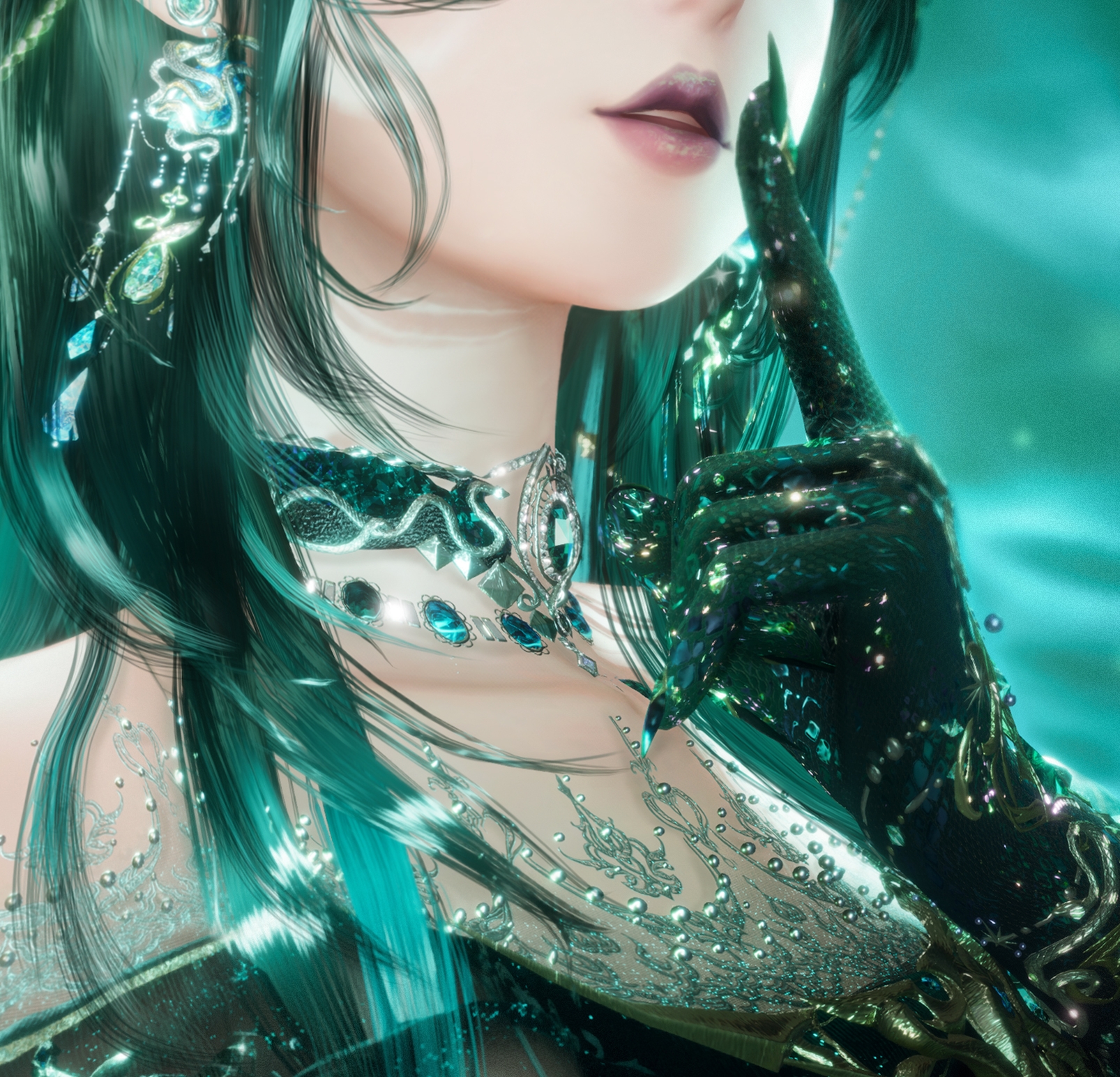 幽暗之處的水澤中,生活著一位皮膚白皙、氣質清冷高貴的蛇女。本次套裝整體正是以蛇元素和幽暗之處的微光水潭作為核心靈感發散設計。