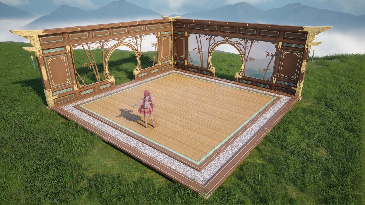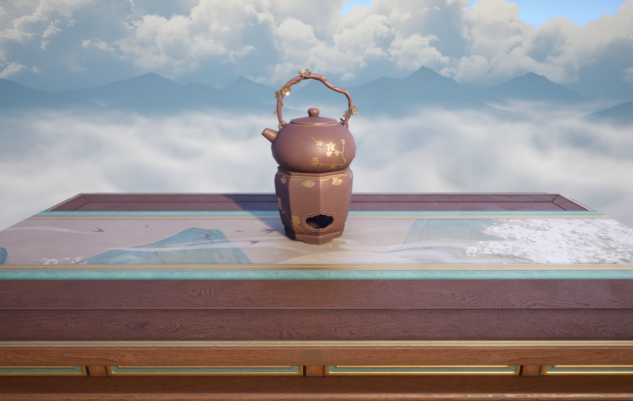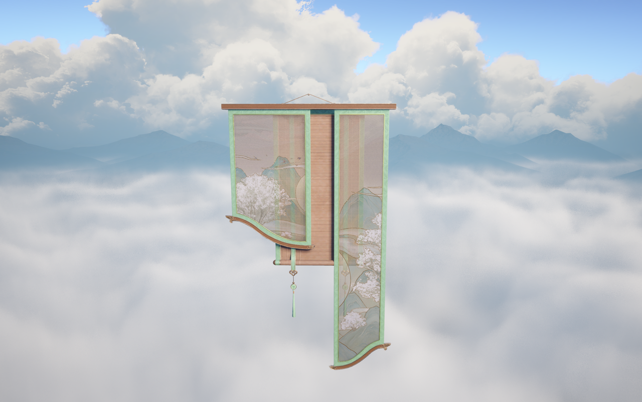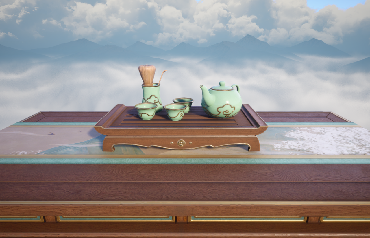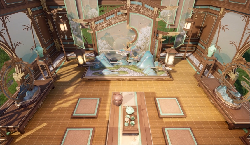 其中【千秋歲屏風】傢俱,搭配師使用丹青能力擊中,可以使屏風外生長出植物,同時出現對應的氛圍特效。不同染色效果的屏風使用丹青能力會出現不同植物,氛圍特效可透過手動互動後取消。以下為「閒時煎茶套組·一」具體包含的傢俱: