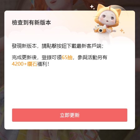 遊戲仍處於啟動狀態時,在登錄介面將出現以下彈出式視窗提示,點擊【立即更新】後將下載新版本,下載完成後即可正常體驗。