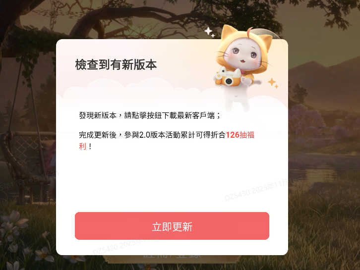遊戲仍處於啟動狀態時,在登錄介面將出現以下彈窗提示,點擊【立即更新】後將下載新版本,下載完成後即可正常體驗。
